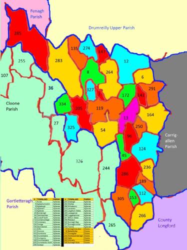 This map shows the townlands of Aghavas, and also identifies any adjacent townlands of within-scope parishes. Hovering over and selecting the name of an in-scope parish will bring that parishes' townlands into view. The map also outlines surrounding out-of-scope Leitrim parishes and any bordering counties.