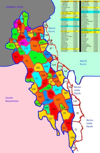 This map shows the townlands of Annaduff, and also identifies any adjacent townlands of within-scope parishes. Hovering over and selecting the name of an in-scope parish will bring that parishes' townlands into view. The map also outlines surrounding out-of-scope Leitrim parishes and any bordering counties.
