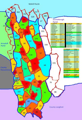 This map shows the townlands of Bornacoola, and also identifies any adjacent townlands of within-scope parishes. Hovering over and selecting the name of an in-scope parish will bring that parishes' townlands into view. The map also outlines surrounding out-of-scope Leitrim parishes and any bordering counties.