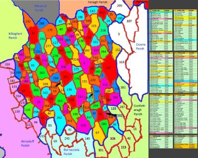 This map shows the townlands of Mohill and also identifies any adjacent townlands of within-scope parishes. Hovering over and selecting the name of an in-scope parish will bring that parishes' townlands into view. The map also outlines surrounding out-of-scope Leitrim parishes and any bordering counties.